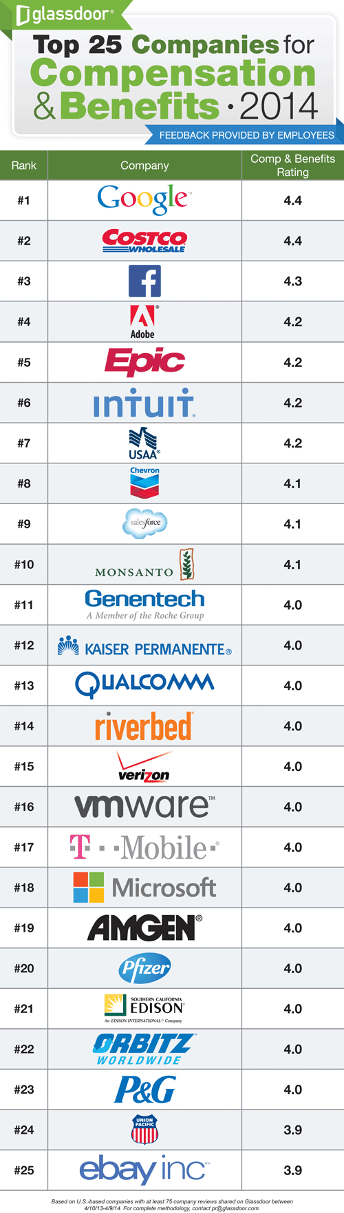But there are companies that earn raves from employees for pay, benefits, and working conditions. Today Glassdoor releases its first report on The Top 25 Companies for Compensation and Benefits. The results are based on a year's worth of verified feedback from U.S. employees who use the career community website.