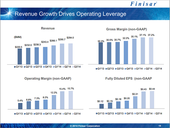 To put this into perspective, Finisar reported $948.8 million in sales during fiscal 2011 and record non-GAAP net income of $138 million. In fiscal 2012, revenues inched up slightly, but gross margins declined to 31.9% from 34.8% in the prior year. On top of that, increased operating expenses in the face of an anemic revenue growth picture and lower gross margin drove a substantial loss of leverage.