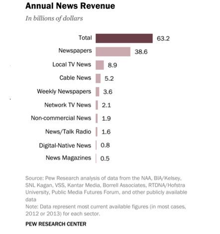 According to the Pew Research State of the News Media 2014, news magazines account for only half of one percent of the total $63.6 billion news revenue market (chart below). More than half of news revenue – 63.2% – is generated by newspapers, which began ad placements on the front page on a wide scale beginning in the early 1990s.