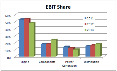 Cummins reports out of four separate segments, with engine and components (mainly trucking) being the most important by far. A breakout of its earnings before interest, or EBIT, demonstrates what really matters.