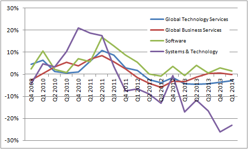 - Hardware revenue (in the systems & technology segment) has fallen off a cliff and is suffering from its exposure to weakening emerging markets.