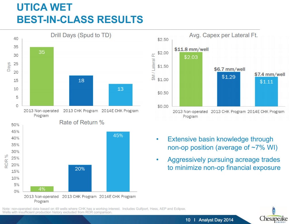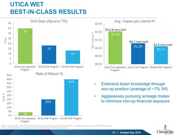 As that slide notes, when Chesapeake Energy invests capital in a non-operated well drilled by a company like Hess its rate of return on that well averages just 4%. However, when Chesapeake Energy invests in a well where it's the operator it earned 20% last year, with that return heading higher this year as it continues to improve. These results are why Chesapeake Energy continues to drill in the Utica Shale while smaller peers like Halcon Resources have given up and while Hess has decided to sell some of its land position.