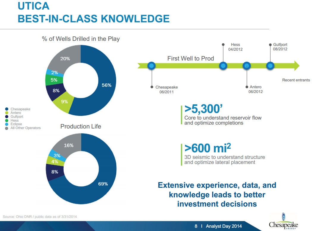 Chesapeake Energy already has a long history in the Utica Shale. It was the first company to turn a well into production in June of 2011. The competition didn't start putting wells online until nearly a year later when Hess (HES +0.00%) brought its first well into production that April. Being first in the basin is proving to be a real competitive advantage for Chesapeake Energy as it has drilled more wells than all of its competitors combined as the following slide shows.