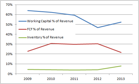 Unfortunately, investors received some bad underlying news on this issue in 2013. Simply put, a combination of weaker than expected revenue growth, and more importantly, the need to carry more inventory managed to eat into its cash flow conversion. Indeed, a table of its revenue and free-cash flow guidance over the year reveals what happened.