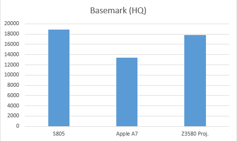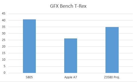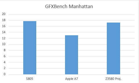 In the GFXBench Manhattan test, the Snapdragon 805 again outpaces the A7 and the projected Z3580 results.