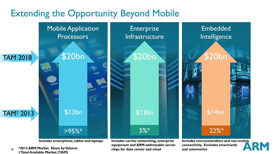 At ARM's own analyst day, it gave the following helpful slide presenting its estimated total addressable market, or TAM, during 2013 and where it expects those TAMs, by segment, to be by 2018 -- which probably, not coincidentally, explains AMD's numbers.