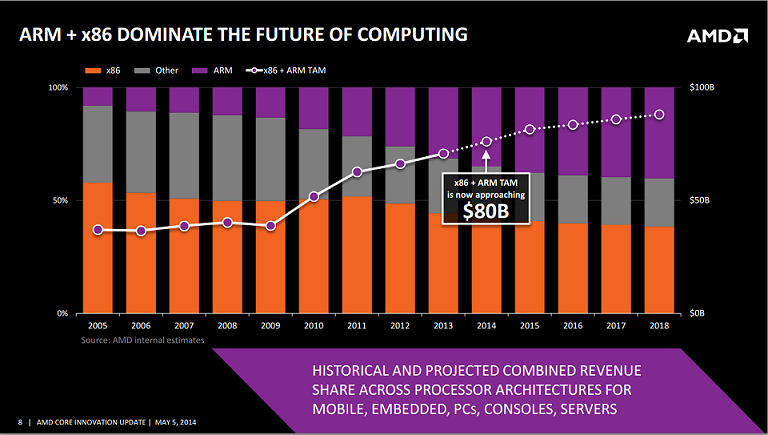 ARM says its TAM is about $40 billion today, and the company expects that that figure to grow to $60 billion by 2018. AMD seems to be mirroring these projections, but these numbers overinflate AMD's "opportunity" in the following ways.