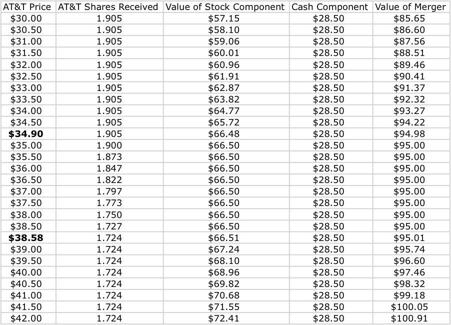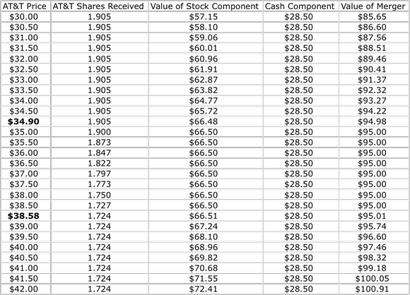 In the event that AT&T's stock is trading at a price of $38.58 or higher at the time the deal closes, DirecTV's shareholders will receive just 1.724 shares of AT&T stock for each share of their stock (plus the cash component). In the event that AT&T's stock is trading at $34.90 or lower this ratio will rise to 1.905, while something in the middle would be calculated using AT&T's initial $66.50 share-equivalent offer divided by the company's current stock price.