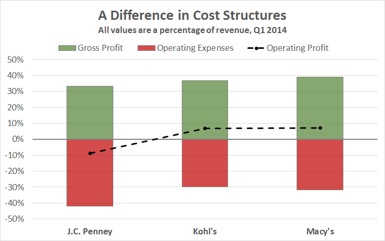 Single-digit same-store sales growth is simply not enough, given the massive declines during the previous years. Even though J.C. Penney has managed its operating expenses well its cost structure is still unsustainable, especially compared to the competition: