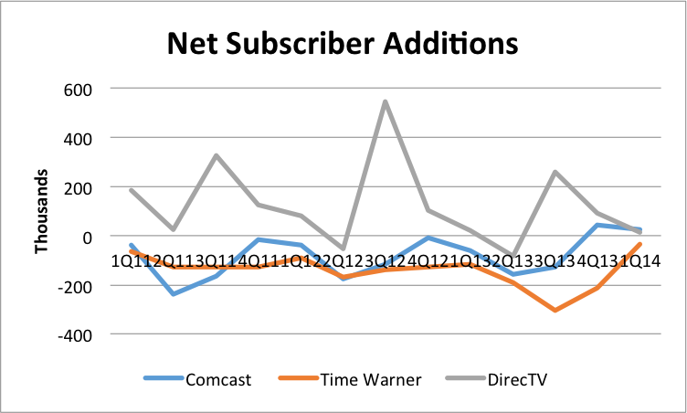 Time Warner has the losing seat despite a slight recovery in the first quarter. And DirecTV has spent most of the past three years with the most net subscriber additions, which also means the least net losses.