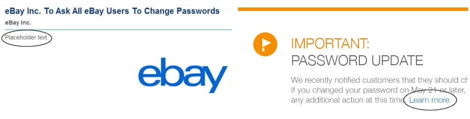 The company then failed to send out a mass email in a timely manner to customers, who were mostly informed via news outlets. When eBay finally posted a warning at the top of its website, it contained a "Learn More" link that led to a blank page (which remains blank at the time of this writing). A few days ago, customers were also confused by empty "Placeholder Text" in PayPal's blog entry about the data breach.