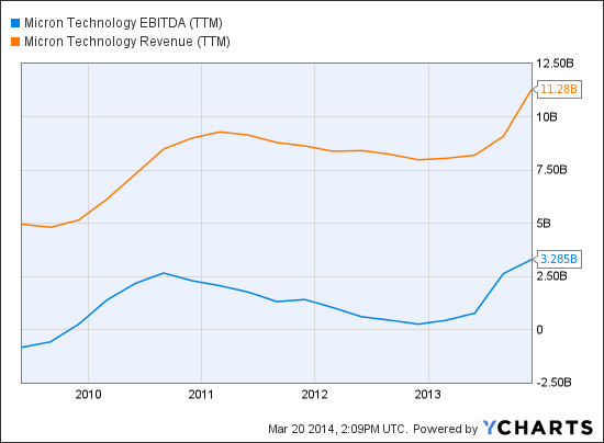 Micron's revenue has largely benefited from its Elpida Memory acquisition, making the combined entity the second-largest DRAM chipmaker. The benefits of the merger have exceeded expectations, and greatly boosted Micron's revenue and earnings. Micron's revenue grew 97.6% over the last 12 months, compared to the industry average of just 3.4%, and the company's earnings grew an astounding 317.8%.