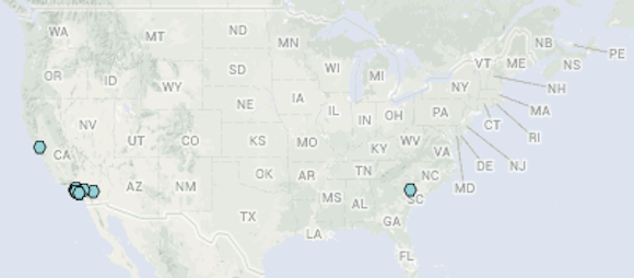 A map of the 11 hydrogen charging stations. Source: Alternative Fuels Data Center