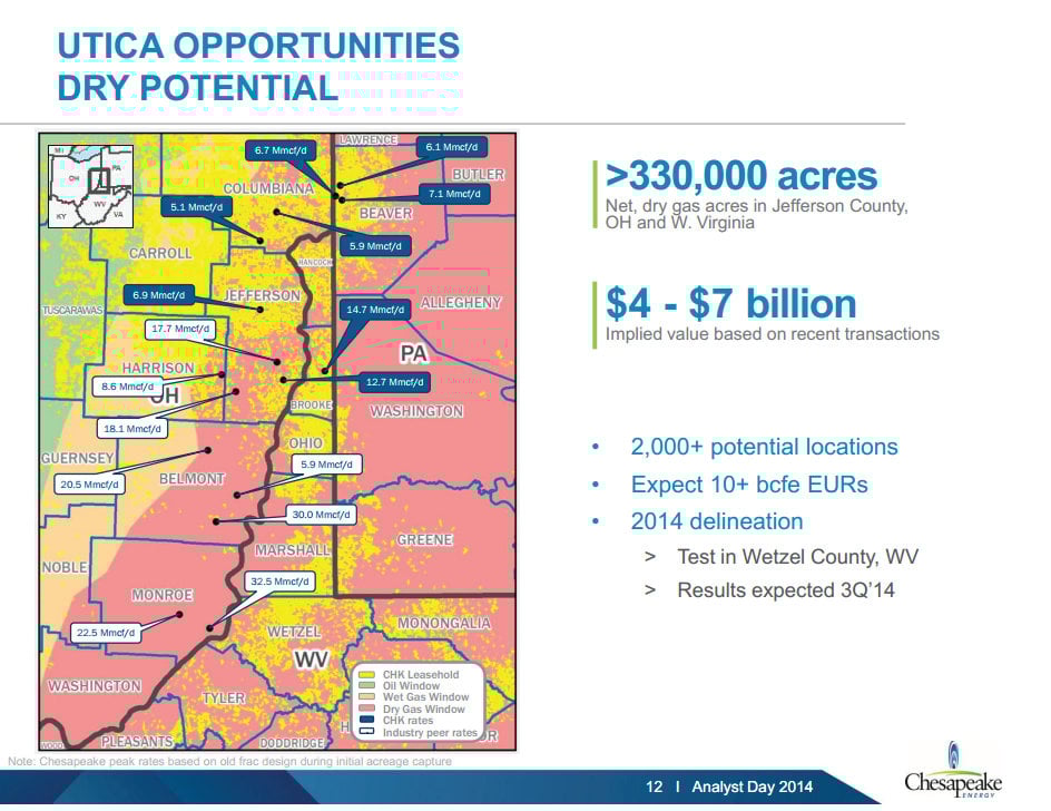 One thing that his former employer, Chesapeake Energy, is finding is that the dry gas potential of the Utica Shale is proving to be more lucrative than investors realize. The company and many of its peers are drilling impressive wells as seen on the following slide: