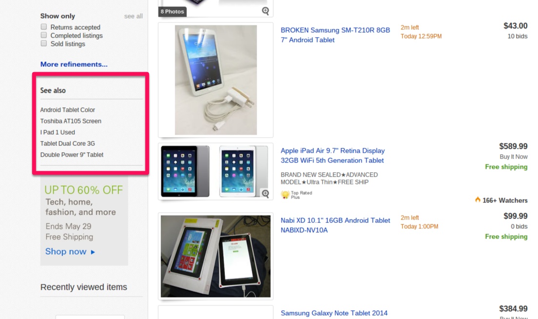 Rishi Lakhani at Refugeeks pointed out that all of eBay's organic Google search results have "/bhp/" after the main domain name. Clicking through eBay, you'll find them under the "See also" header on eBay's search results page. The links seem to be generated based on popular search terms. Apparently, Google doesn't like this tactic, even if the links are arguably useful.