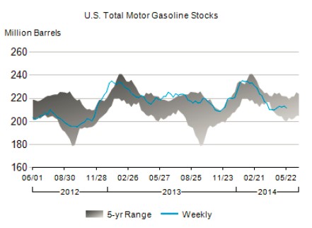 While oil supplies increased, gasoline inventories fell 1.8 million barrels (0.8%) in the past week after expanding 1.0 million barrels the week before. Demand for motor gasoline over the last four-week period is up a seasonally adjusted 5.4%. In the last year, supplies have dropped 3.5%.