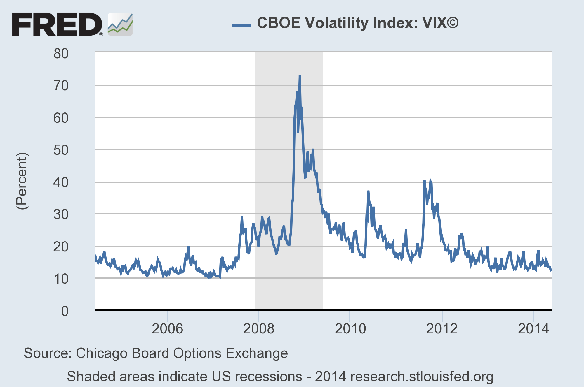 U.S. stocks put in yet another record high on Thursday, as the benchmark S&P 500 rose 0.5%. The narrower Dow Jones Industrial Average (^DJI +1.08%) was up 0.4% to close within 10 basis points of its all-time high, while the technology-heavy Nasdaq Composite Index (^IXIC +0.88%) gained 0.4%. But while the S&P 500 may be at an all-time high, the volatility of the S&P 500, as measured by the CBOE Volatility Index (^VIX 11.32%), is near multi-year lows. Speculators who gamble on the index using products including the iPath VIX Short-Term Futures ETN (VXX +0.00%) and the Velocity Shares 2x VIX Short-Term ETN (TVIX +0.00%) ought to consider whether we have shifted to a new regime of ultra-low volatility. If so, all investors may want to ask why and what are the possible implications for the capital markets?