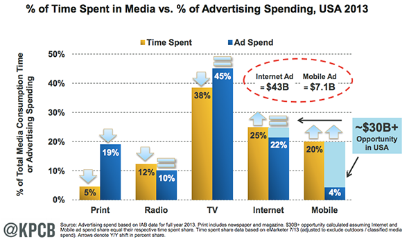 Mary Meeker, one of the first tech analysts, details trends around the Internet each year. In one of the more striking charts, she calculates that if advertising spend caught up with actual time users spent on mobile devices, mobile advertising would increase by $30 billion: