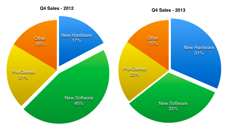 Ironically, the success it's had in selling more consoles has actually hurt GameStop's bottom line. Those devices are the lowest margin products that it offers, and so profitability has taken a hit as new consoles grow to a bigger proportion of sales. Over the holidays, for example, hardware sales doubled as a percentage of sales, dragging profitability down with it.