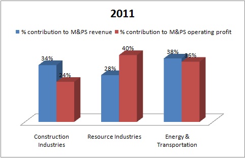 As you can see, Caterpillar's resource industries division made up 40% of its M&PS operating profits despite contributing only 28% to sales in 2011. Conversely, construction industries had a much greater share in revenues but the lowest share in profits at 24%.
