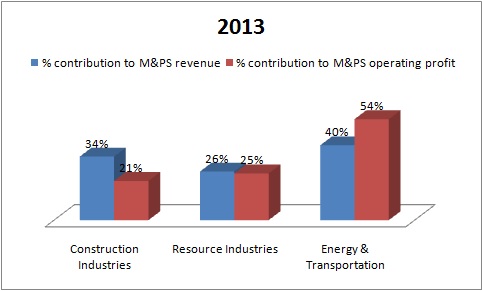 The figures for 2012 had a similar story to tell, with resource industries contributing a whopping 45% to Caterpillar's M&PS operating profits compared to construction industries' 19% share.