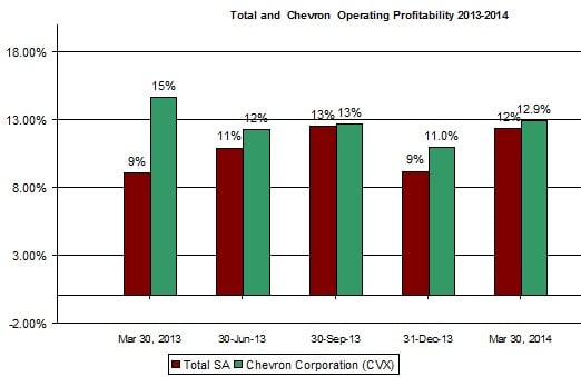 Chevron is also able to translate a higher portion of its revenue to operating cash flow. In 2013, the company's operating cash flow to revenue ratio reached 16%, while Total's ratio was 13%.