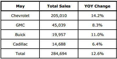 General Motors' May sales increase was clearly driven by its mainstay Chevrolet brand. Chevrolet sales were up 14.2% compared to last May and accounted for nearly 75% of GM's 284,694 sales.