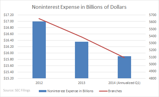 From first quarter 2013 to first quarter 2014, the bank cut 294 branches. Noninterest expense fell by $180 million per quarter during that time.