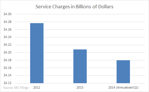 If it weren't enough that Bank of America pays peanuts for deposits, service charge revenue has been coming in to the tune of more than $4 billion per year. Service revenue has declined slightly, but a 2% decline in light of an improving economy is nothing to worry about. It turns out late fees and overdrafts tend to peak in recessions, not recoveries.