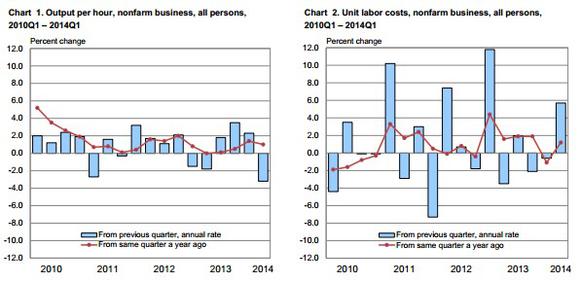 Comparing this quarter to Q1 2013, productivity has still squeaked out a 1% improvement as output improved more than hours worked increased, although unit labor costs are up a relatively larger 1.2%.