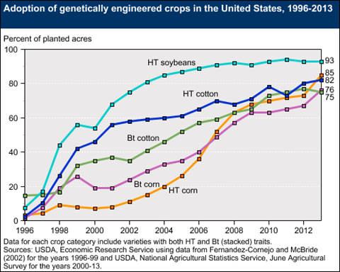 The problem is, virtually all soy grown in the U.S. today is genetically modified. According to the U.S. Department of Agriculture, some 93% of the soybeans grown on U.S. farms are herbicide tolerant, meaning they've been genetically engineered to withstand herbicides, mostly Monsanto's (MON +0.00%) Roundup brand. That percentage is up from 68% in 2001 and from just 17% in 1997, making it the second largest GM crop in the country behind corn, but also the most widely planted GMO crop ("only" 85% of U.S. corn is genetically modified).