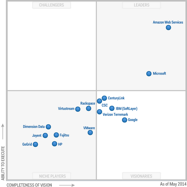 Only Microsoft was ranked in the ''market leaders'' quadrant with AWS.The Gartner report noted that the other vendors are still far behind AWS and Microsoft Azure.