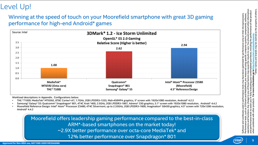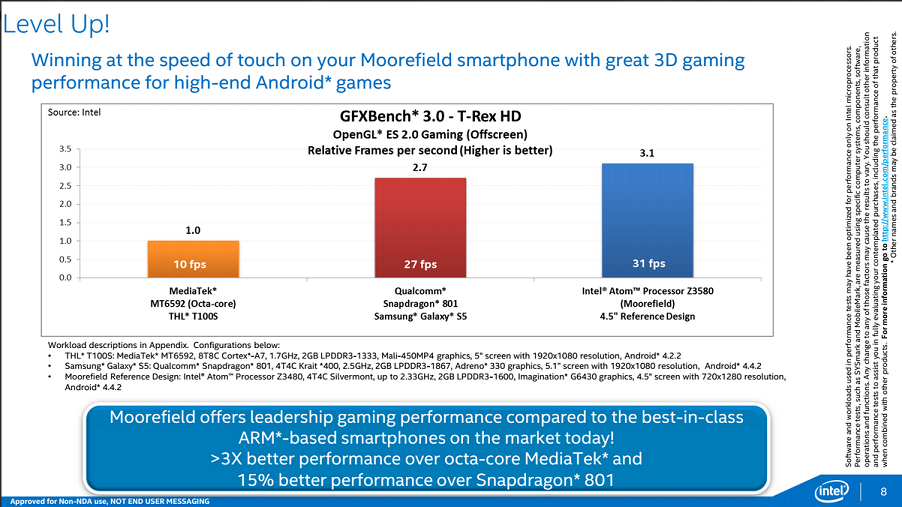 Intel's (INTC +6.75%) mobile group has had some pretty serious execution issues during the last several years. It's not that the company can't design good, low-power chips; it's that by the time these parts actually make it to market, they're just not that great anymore, and end up in the proverbial bargain bin. At Computex 2014, Intel shared some performance numbers for its recently released Atom Z3580 (codenamed Moorefield) product, and the numbers do look good, but investors should view it more as a key technological milestone rather than a product that will drive meaningful top/bottom line upside this year.