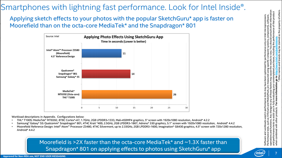 As you can see, both the Intel and Qualcomm (QCOM +0.89%) chip are faster than the ridiculous "octa-core" MediaTek part -- which uses eight wimpy cores versus Qualcomm/Intel, which use four strong ones. The Intel chip seems to be about 27% faster than the Snapdragon 801 in a real-world application. This is an impressive showing, especially since the Intel chip is delivering this kind of performance in a 4.5-inch reference design against the Snapdragon 801 found in a 5.1-inch device.