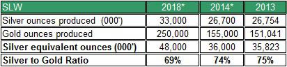 Based on Silver Wheaton's projections, in 2014, its attributed gold production is likely to reach 155,000 ounces, which accounts for nearly 74% of its total operations. Looking even further, the company expects its gold operations to rise by over 60% in the next four years, as seen in the table below.