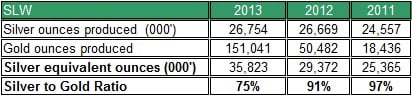As indicated in the table above, in the past several years the amount of silver production as a percent of total silver equivalent ounces dropped from 97% back in 2012 to nearly 75% in 2013.