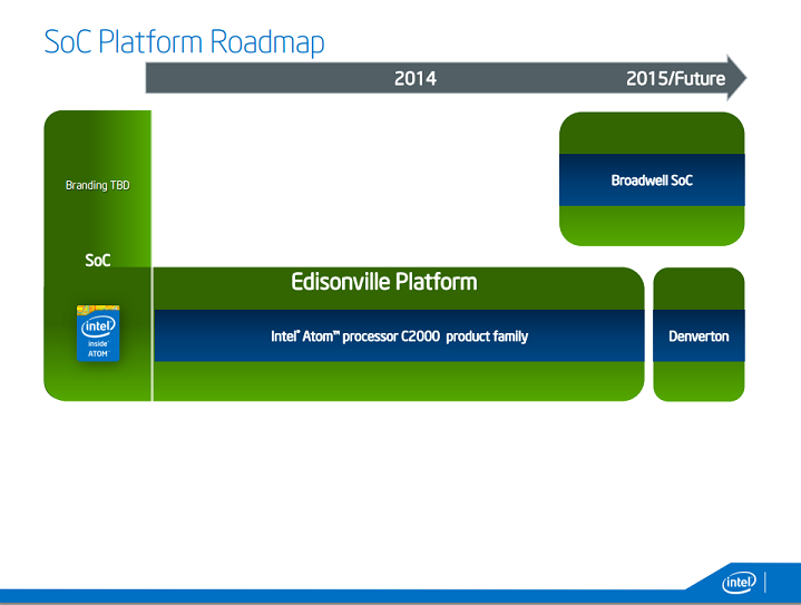 Now, this road map tells us vague launch time frames, but the point here is that Intel is not going to leave any potential market segment exposed. If the customer wants a low-power system-on-chip with a lot of small cores, then Avoton/Denverton will be the right solution. However, if fewer, more powerful cores integrated in a system-on-chip float the customer's boat, then Broadwell SoC (known as Broadwell-DE) and its follow-ons will be the right product.