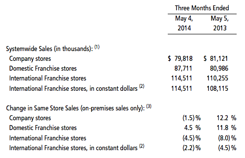 According to the company's earnings release, the main driver behind its higher (but lackluster) sales was a 3.3% increase in store count combined with a 4.5% improvement in domestic franchised comparable-store sales. This was, however, offset by comparable- store sales declines in the business' company-owned stores and its international franchised locations.