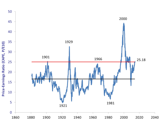 In fact, the CAPE has only crossed above the 25 level four other times in history. The first time was in June 1901. From June 1901 to November 1903, the Dow Jones dropped more than 46% in what was later known as the Panic of 1901. The next time the CAPE crossed above 25 was November 1928. Of course, "Black Tuesday" occurred about one year later, and from mid-1929 to mid-1932 the Dow dropped 96% as the Great Depression set in.