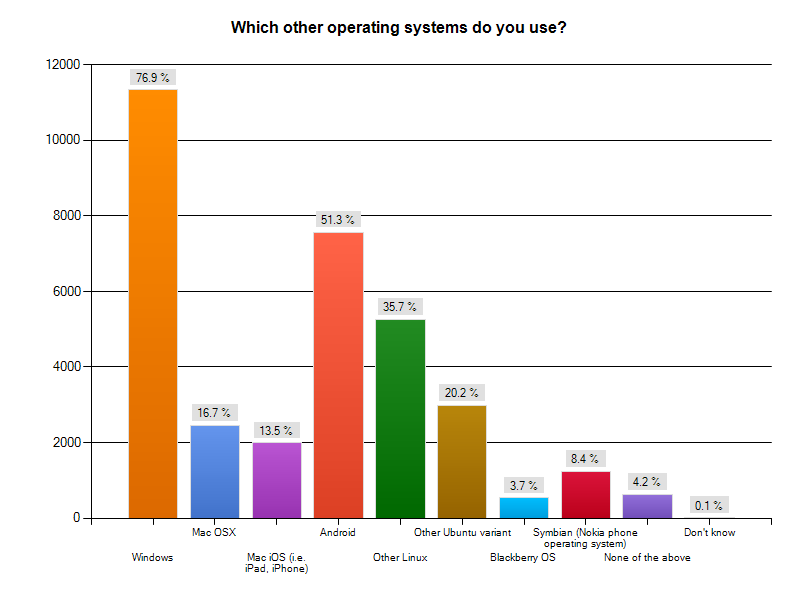 Microsoft's OneDrive is mainly used as a backup cloud for Windows devices, especially PCs, since Windows OS commands over 90% market share. Windows Phone market share is still quite small (around 3%.) Although Linux commands just 1.62% of desktop OS market, the fact that more than three-quarters of Ubuntu One users also use Windows means that Ubuntu One probably has a lot more users than what Linux OS market share would suggest.