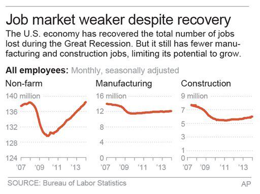 There are still 1.49 million construction jobs missing. Factories have 1.65 million fewer workers. Many of these jobs have been permanently replaced by new technologies: robots, software and advanced equipment that speeds productivity and requires less manpower, said Patrick O'Keefe, director of economic research for the advisory and consulting firm CohnReznick.