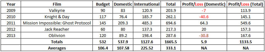 Yet it's the past five years you really need to look at -- Cruise has had a number of misfires with the Oscar-bait movie that wasn't in Valkyrie and the critically lambasted Knight and Day. It also included the aforementioned Rock of Ages, but since that was an ensemble movie and not fully on Cruise's shoulders, I'm leaving it out of the equation. What you'll notice in what I call "The Bankability Breakdown" is that despite those movies and the under-performing Jack Reacher, each one recouped its budged thanks to international ticket sales.