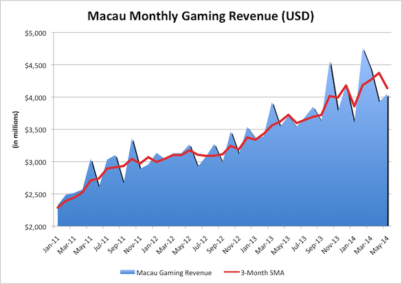 There's no doubt that Macau's growth has slowed recently. Following years of growth in excess of 50%, growth was 42.4% in 2011, 13.5% in 2012, and 18.6% last year. That broad slowdown has been followed by 15.8% growth so far in 2014 but just 9.3% growth in May, and analysts are now expecting June to be barely positive.