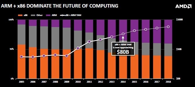 Although the market share of x86 server chips has been gradually coming down to the current 40%, AMD says that the share will stabilize in 2015 around 39%. Mercury Research estimates that the x86 server chip market is worth about $12 billion this year. Meanwhile, the market share of 64-bit ARM chips is expected to gradually grow through 2016, and hit a plateau with a 38% market share.