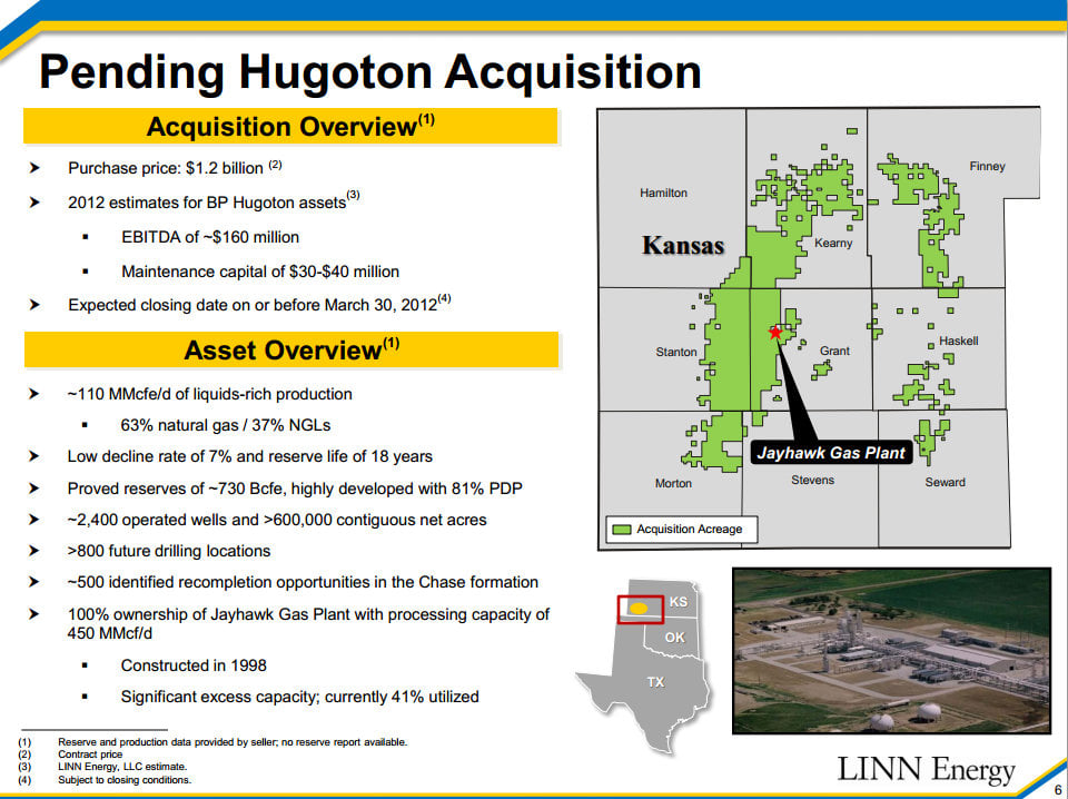 LINN Energy in 2012 spent $1.2 billion for 2,400 shallow-decline, liquids-rich natural-gas wells in the Hugoton Basin, along with a few hundred future drilling locations, as the following slide shows.