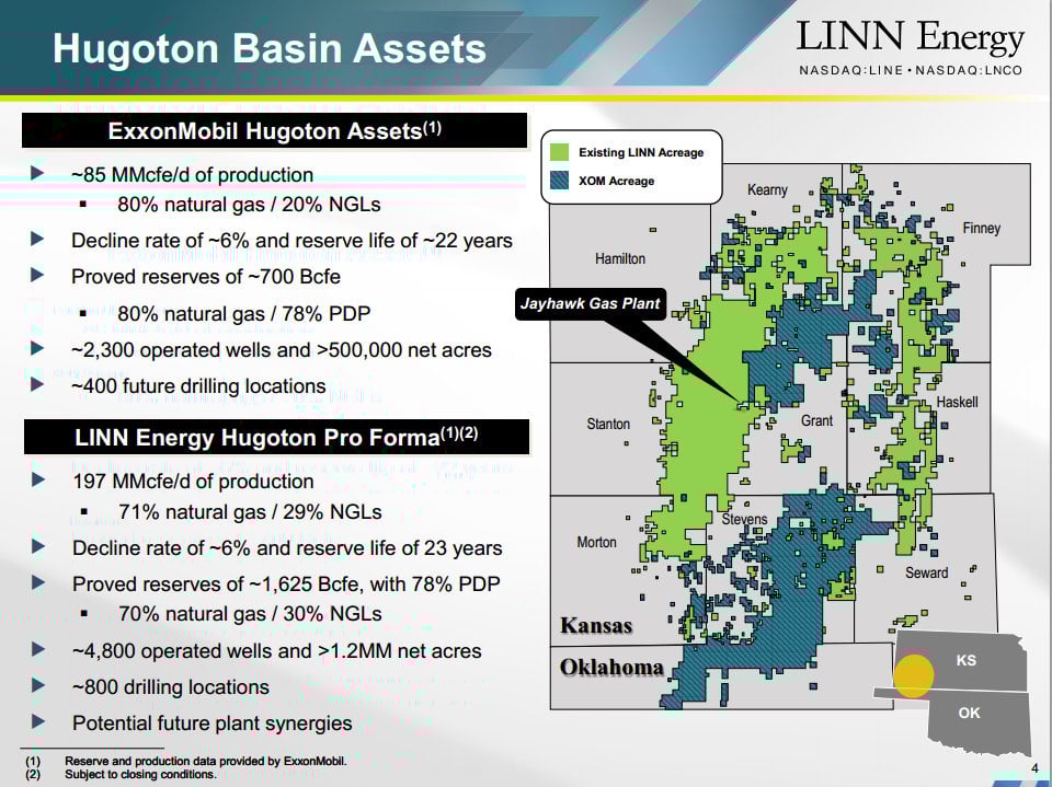 More than half of that utilization comes from LINN Energy's current production in the Hugoton Basin, which is about 112 MMcfe/d. The addition of ExxonMobil's Hugoton Basin assets adds another 85 MMcfe/d of liquids-rich natural gas, as the following slide shows.