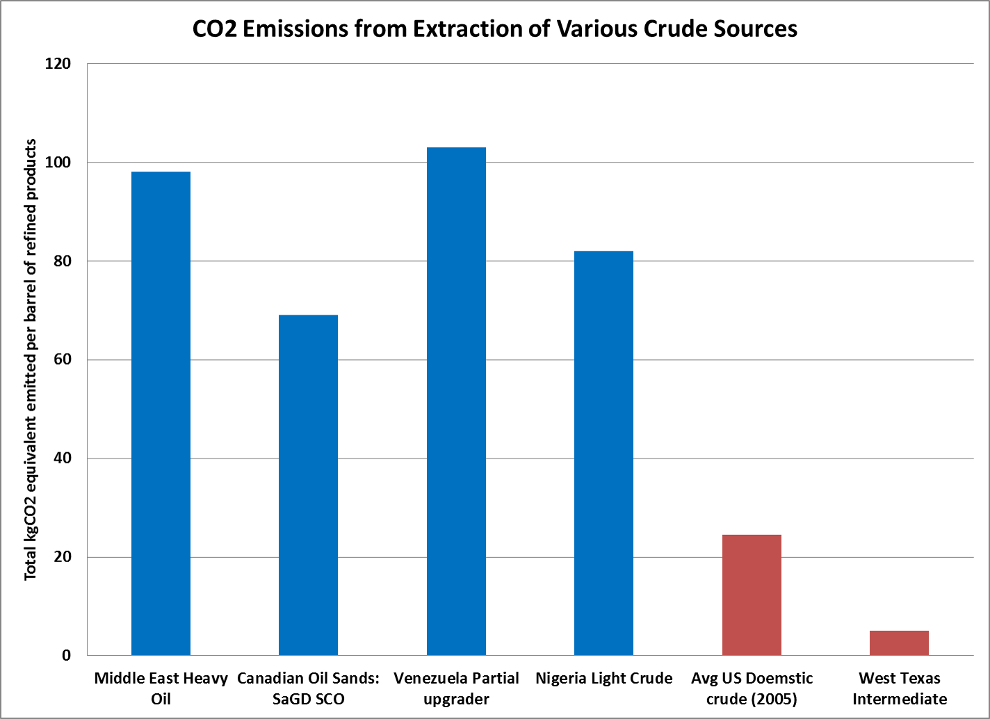 2. U.S. resources are actually less carbon intense than those from other nations. Take a look at this chart based on data from IHSCera, it shows the total CO2 equivalent for producing a barrel of oil for various locations around the world. The production of West Texas Intermediate crude is by far and away the least carbon intensive oil source, and in some cases it is 15-20 times less intense than from major oil exporting regions such as Venezuela and the Middle East.