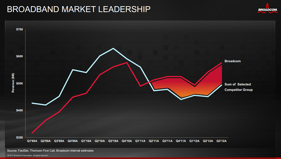 By far the largest player in the connected home and set-top box market is chipmaker Broadcom (NASDAQ: BRCM), which has more revenue than all of its major competitors in this space combined.