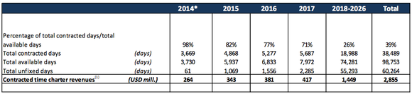 One of the nicest things about LNG shipping companies is their long-term charters and GasLog is no exception to this. What this means is that the company that needs to ship LNG will commit to use the LNG tanker for a long period of time, usually several years. This works out quite well for the tanker company as it provides very strong visibility into future cash flows and effectively provides guaranteed revenues to the tanker owner. We see this in GasLog. GasLog currently has contracts for 98% of its total available time this year and 82% of its time next year. In fact, GasLog has contracts that provide the company with guaranteed revenues until 2026.