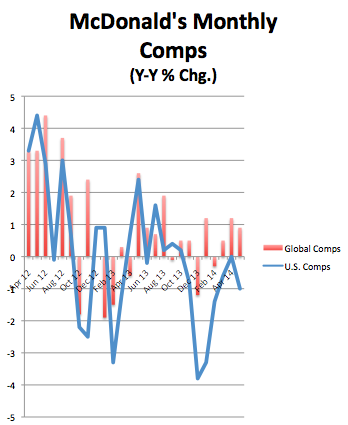 The Golden Arches reported yesterday that global sales rose 0.9% in May on the strength of a strong recovery in China, but that was going up against the much easier comp from the prior year when sales were affected by a new outbreak of avian flu. Yum! Brands chicken palace KFC was also caught up by the devastating impact of the bird illness that had Chinese consumers shunning all poultry; it watched its comps plunge month after month. By the end of 2013, though, it had regained its footing and in first-quarter results reported in April, Yum! said KFC enjoyed an 11% surge in same-store sales in China.